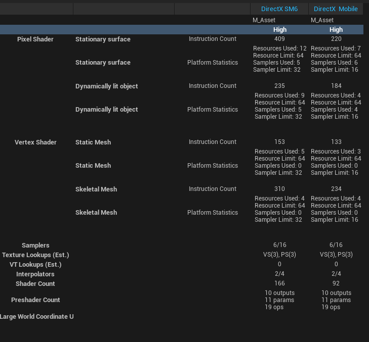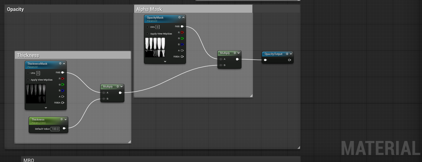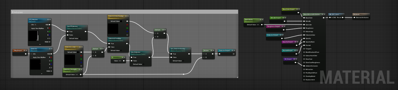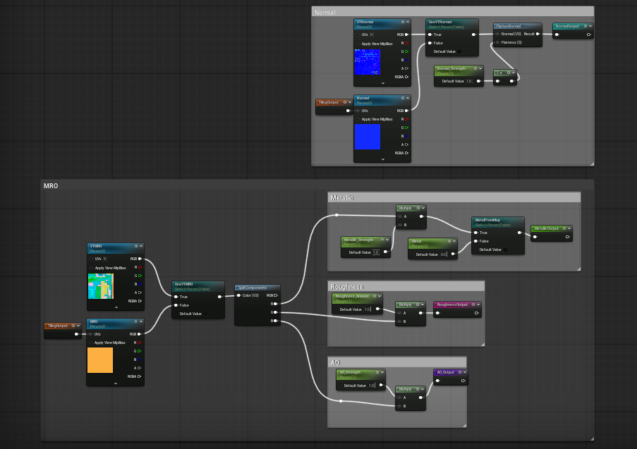 Assets textures are packed to efficiently manage base color with opacity in alpha, metallic, roughness and ambient occlusion (MRO), and normal maps. Emissive maps can be toggled when applicable. This structure repeats through each of the master materials I created for Shadows of Dawn at Next Player Games.
