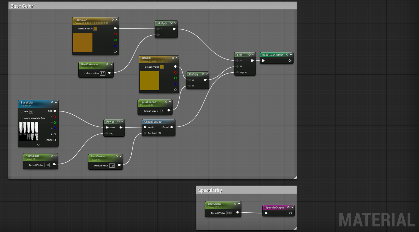 Root and tip gradients lerp between root and tip colors independently, and each feature their own saturation and contrast parameters. The tangent map allows for directional highlight behaviors to achieve the realistic visual quality we are striving for at Next Player Games. For ease of use for the artists, the material also mimics the MRO structure of our other master materials. Finally, dithering and pizel depth offset help in the reduction of artifacts in alpha cards.
