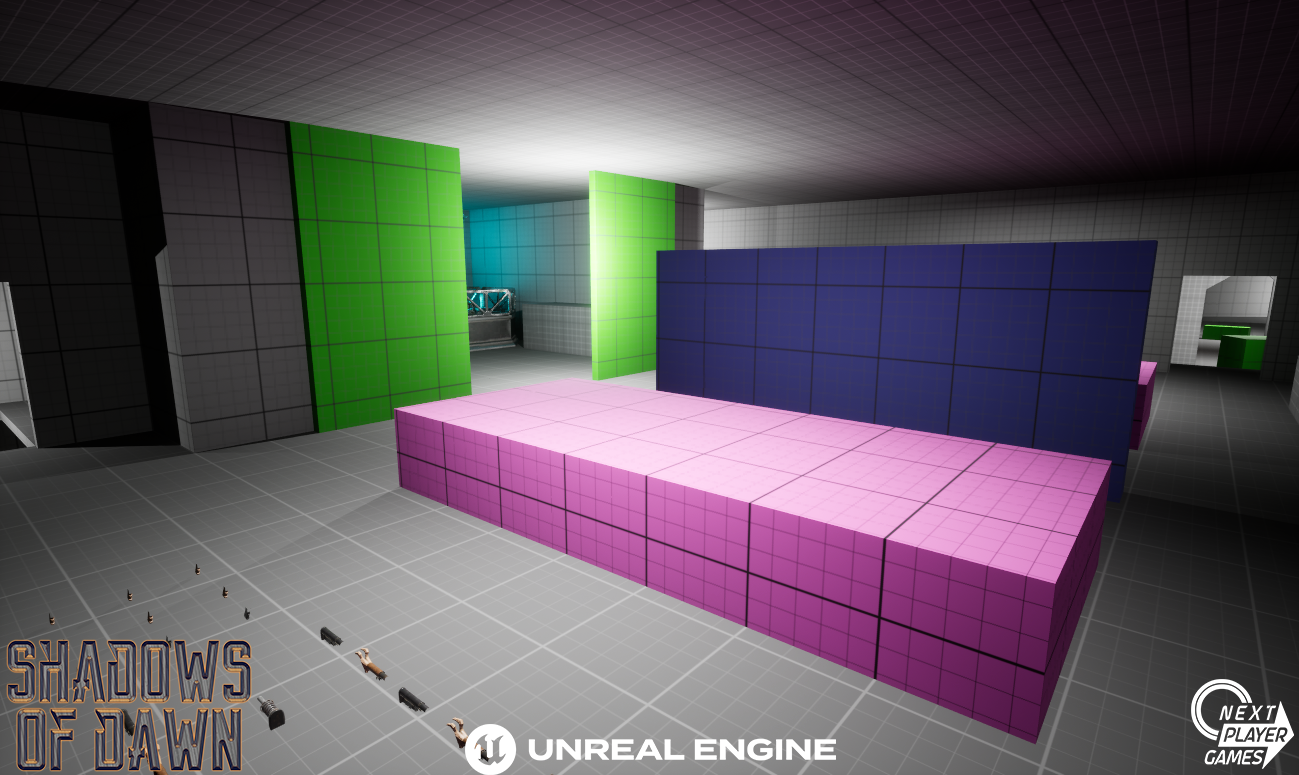 Multiplayer in Shadows of Dawn will let you put your skills to the test in PvP while coordinating with your squads. Our goal is to blend fast paced action and strategical approaches by focusing our gameplay around player character builds. Designing the multiplayer maps is an integral part of making sure that resonates through the gameplay. To accomplish this I make sure to create maps that focus on objective zones and provide approach options for each playstyle. This way I create a balanced map. I've incorprated multiple chokepoints and flanks with varying covers and elevations to create variation throughout the map. While working on the layout, I kept in mind that this smaller version will fit together with other smaller maps to create a large scale level that exists within the Single Player world and our planned survival and extraction PvPvE modes. This new layout has been adapted from a previous version I had previously created before Shadows of Dawn underwent a direction change. I felt it was best to keep the premise of the map intact while making a more sustainable map for a multiplayer experience. The original concept was for a heavily realistic military simulation extraction shooter. I felt my original design lacked variety by relying too heavily on symmetry, featured too many unbroken sightlines and lacked real elevation changes for ranged players. My new design reinvigorates the playspace by separating our large scale 3D assets that act as focal points in their own centralized hubs housing the objective points on the map. This allowed me to break sightlines in strategic areas, offer elevation variances and provide flanking options to better balance each space.